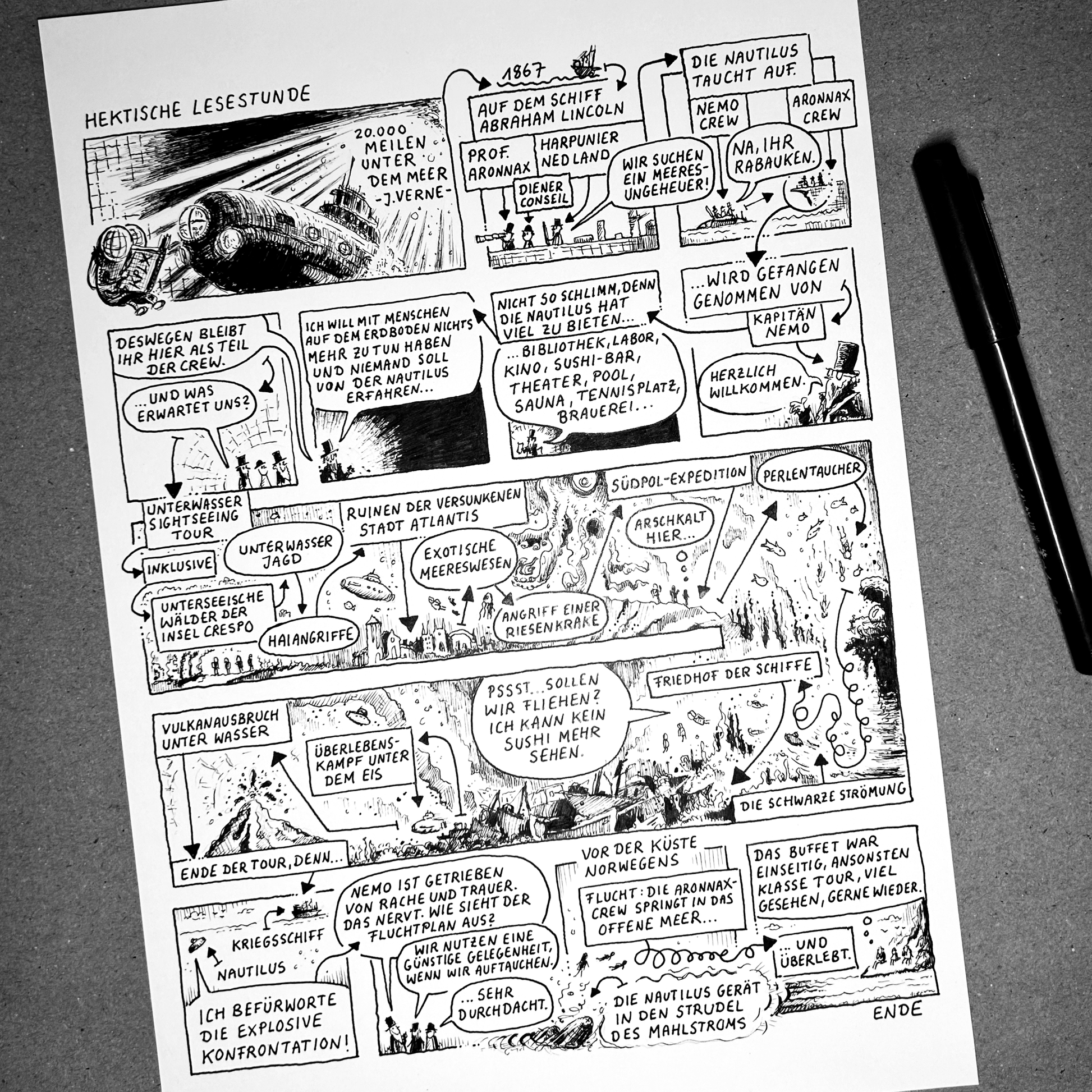 Limited art print of the Kplx drawing "Hectic Reading Hour 6 20,000 Leagues Under the Sea" in A4 size (21 x 29.7 cm) on 250g paper. Each print is signed and numbered. There are 20 signed prints for each Kplx original drawing.
