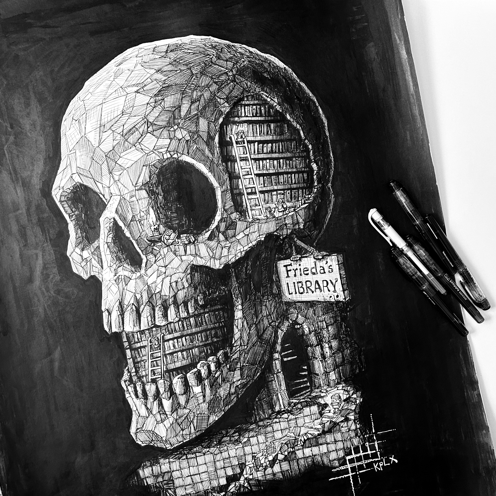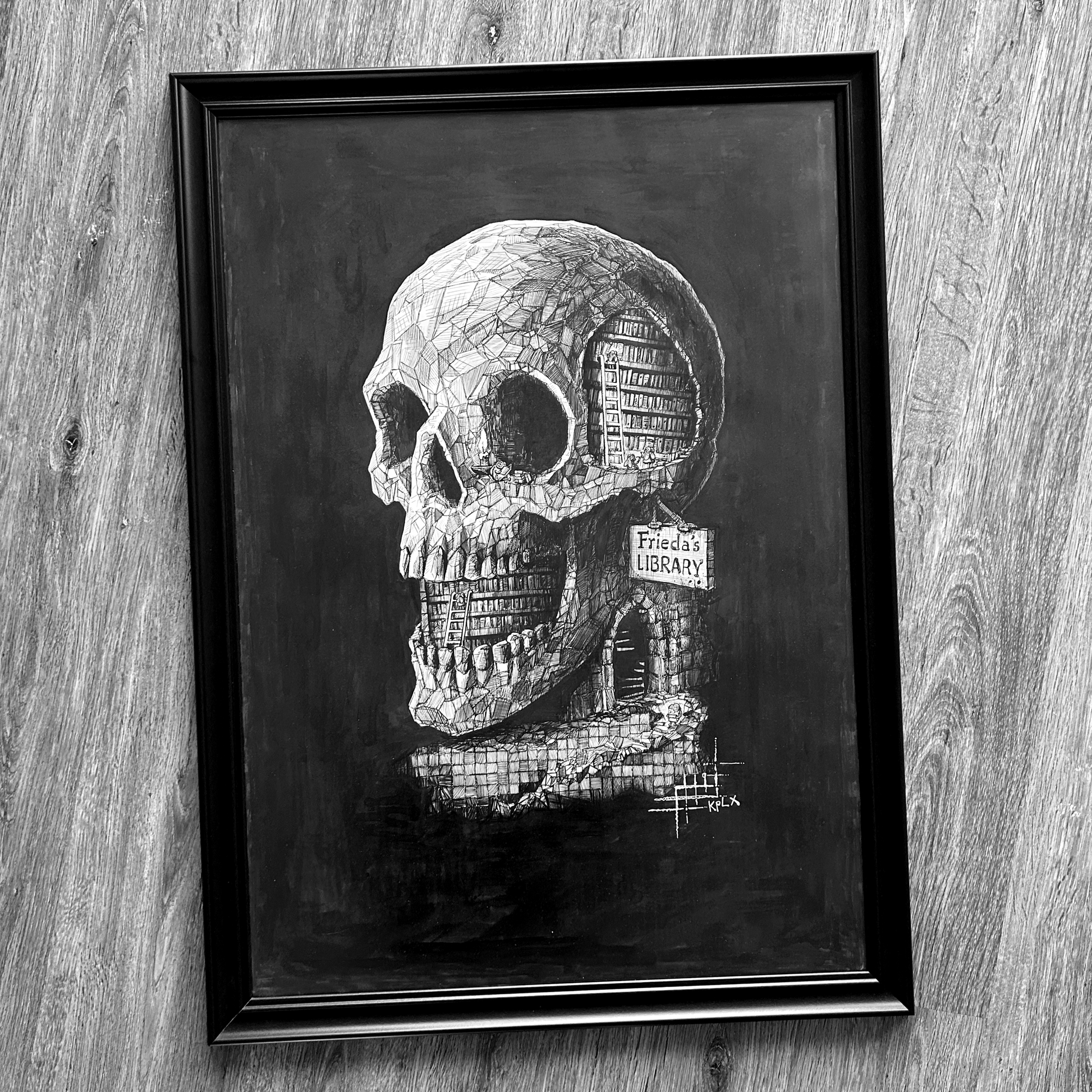 Original A1 artwork by Kplx, framed in a custom-fitted black wooden frame with a matte anti-reflective glass panel, drawn in ink on A1 Canson Bristol 200g.